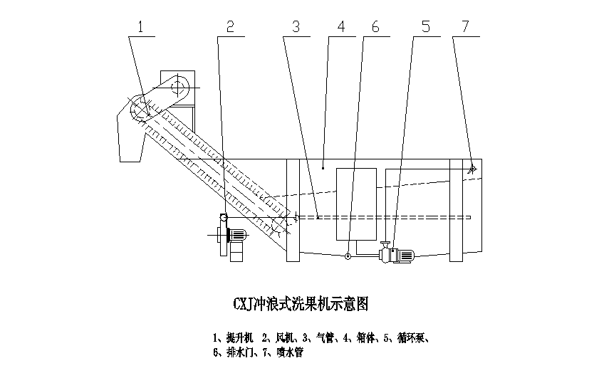 冲浪式洗果机是以风机风力使水产生强烈搅拌运动,使物料在水中翻滚,同时安置在进料口的高压水管喷头将物料用水力推向提升机方向,经黄色蘑菇视频的蘑菇视频污网站由提升机输入下道工序。